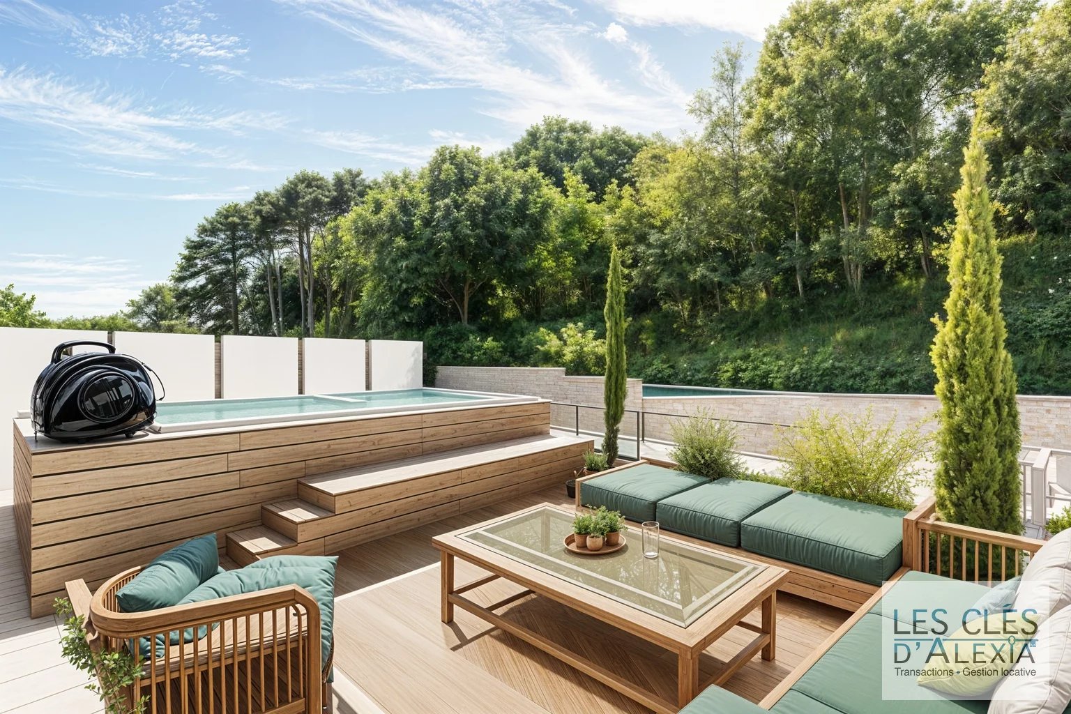 Un solarium de 38m² avec un spa de nage, offrant un espace de détente unique et exclusif.